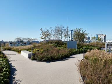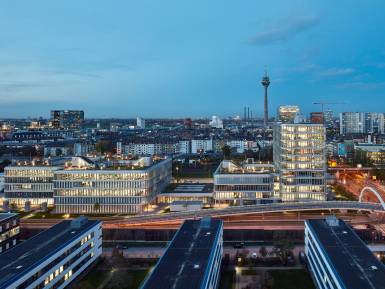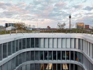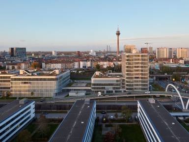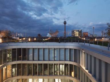 Für eine hohe Aufenthaltsqualität und als zusätzliche Nutzungsebene sind begehbare und intensiv begrünte Dachlandschaften entstanden. Darüber hinaus ist durch die biotopähnliche Gestaltung der Freianlagen im Erdgeschoss eine Art grüne Lunge für den Kreativ-Standort Medienhafen vorgesehen. Ferner wird hier in naher Zukunft ein einladender Boulevard als neue Laufachse von der ÖPNV-Haltestelle „Völklinger Straße“ den Medienhafen erschließen.