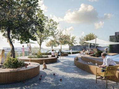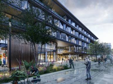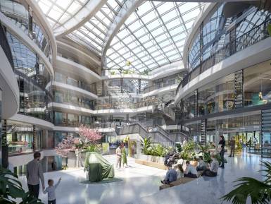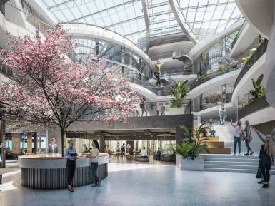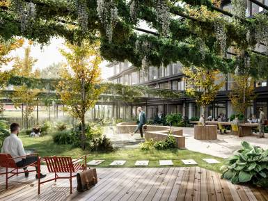 Identity-forming features such as the central atrium, the peaceful terrace garden and the active roof landscapes stand for communication, grounding and health.